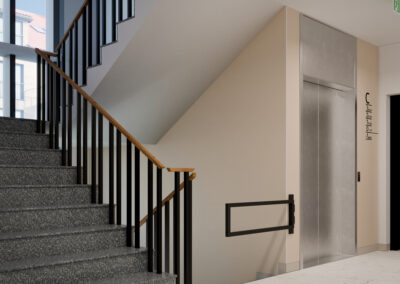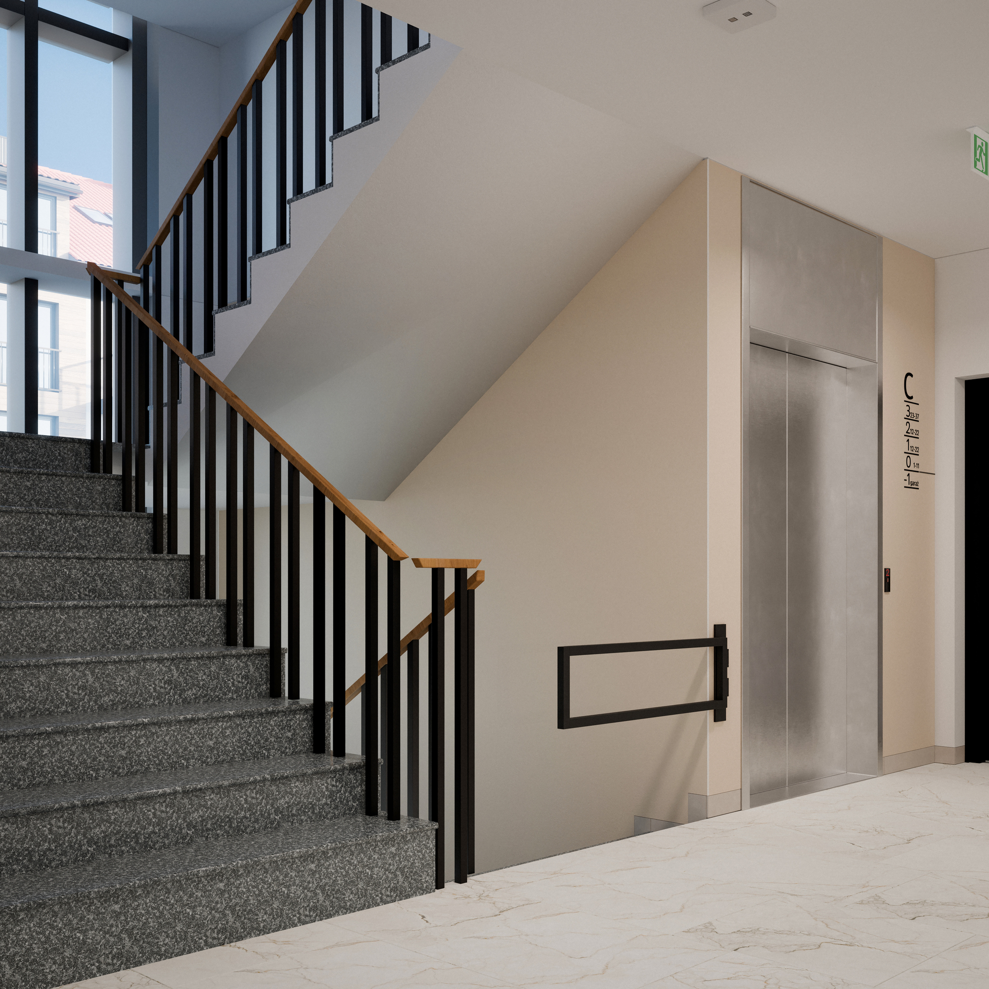 Na poziomie -1 przewidziane są miejsca garażowe. W każdym budynku zaprojektowana jest winda obsługująca wszystkie poziomy.